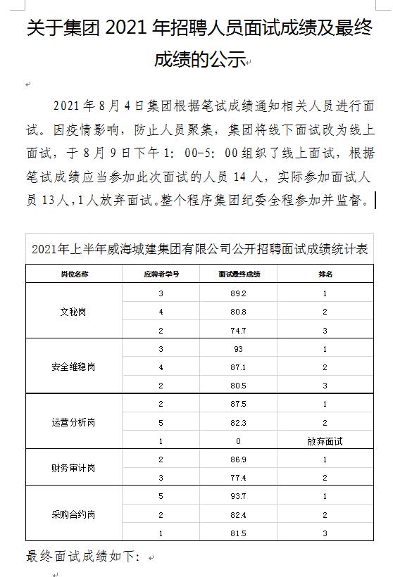 威海城建集團2021年招聘人員面試成績及最終成績的公示發(fā)布時間:2021/8/10 14:09:10  作者:威海城建集團  文章來源:威海城建集團  瀏覽次數(shù):